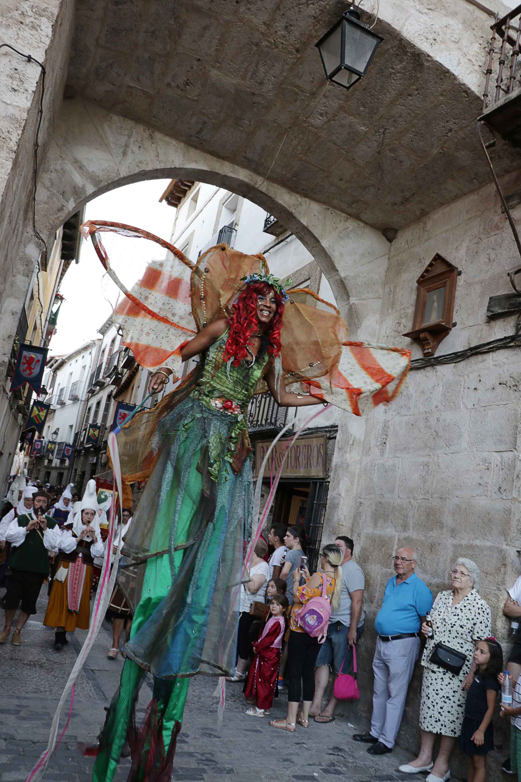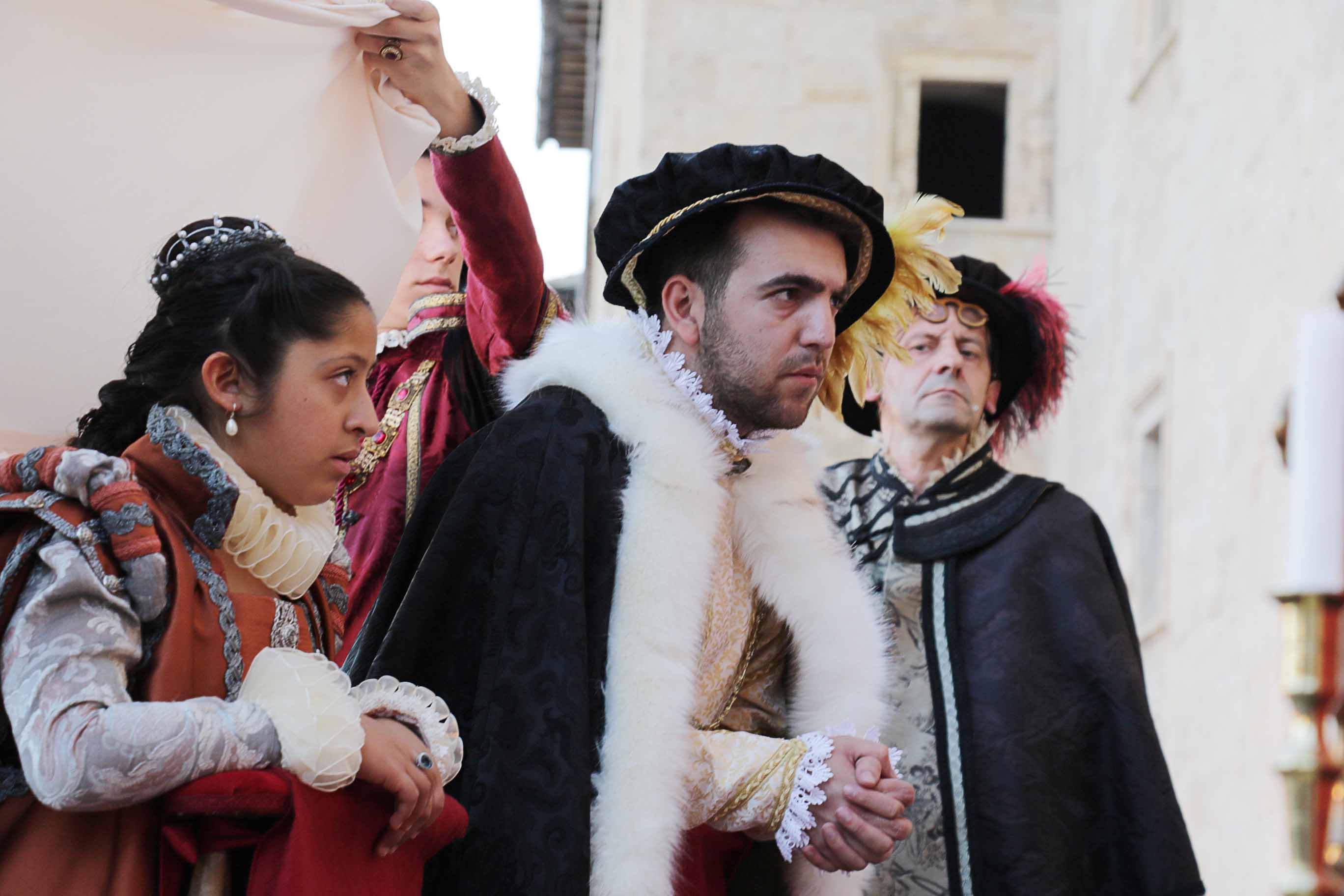 El cortejo recorrió las calles de Pastrana, con demostraciones equinas, musicales y malabares, e incluso una tarasca. Arcos de flores, que atravesaron decenas de veces los novios, culminaron con los esponsales, en la fachada del Palacio, recreada como probablemente fuera en realidad en el año 1572.