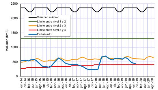 Este informe indica que, a 1 de noviembre de 2019, el volumen embalsado en Entrepeñas y Buendía era de 456,8 hm3, quedando un volumen autorizado pendiente de trasvasar de 19,2 hm3, por lo que resulta un volumen de embalse efectivo de 437,6 hm3, inferior al de referencia de 609 hm3 correspondiente al mes de noviembre. Por tanto, se constató que el sistema se encontraba en la situación hidrológica excepcional o nivel 3, que se inició en el mes de mayo.