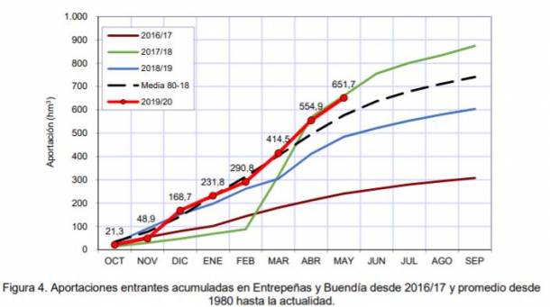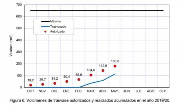 Asimismo, en esta reunión la Comisión ha autorizado, un trasvase para el mes de junio de 38 hectómetros cúbicos (hm3), el máximo posible según los actuales parámetros. El informe de situación, elaborado por el CEDEX y tomado en consideración por la Comisión indica que, a 1 de junio de 2020, el volumen embalsado en Entrepeñas y Buendía era de 828,2 hm3, quedando un volumen autorizado pendiente de trasvasar de 66,9 hm3, por lo que resulta un volumen de embalse efectivo de 761,3 hm3, superior al umbral de 673 hm3 que corresponde al límite de situación hidrológica excepcional para el mes de junio. Por tanto, el sistema continúa en nivel 2 y debe autorizarse, en aplicación automática de la norma vigente, un trasvase de 38 hm3.
