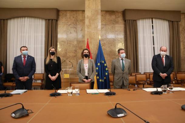 García-Page y la ministra Ribera se pasan las carpetas para la firma./JCCM.El proceso se iniciará el 1 de diciembre y estará abierto a la participación de los agentes hasta el 31 de enero del 2021. Luego se firmaría el convenio con las mejores propuestas.