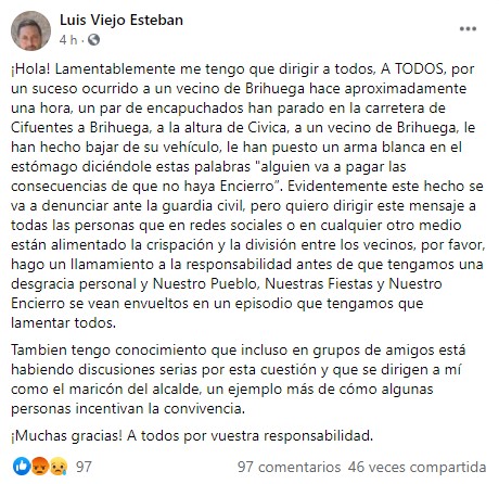 El alcalde de Brihuega, el socialista Luis Viejo, ha denunciado en sus redes sociales que en la mañana de hoy a un vecino de Brihuega hace aproximadamente una