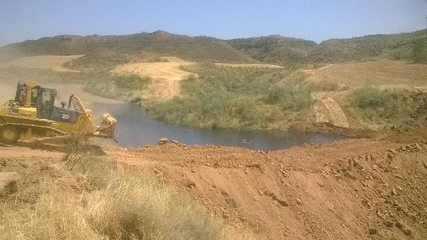 Grandes máquinas construyeron una balsa para evitar que el agua contaminada que despedía la instalación incendiada llegara al río Henares/ Archivo