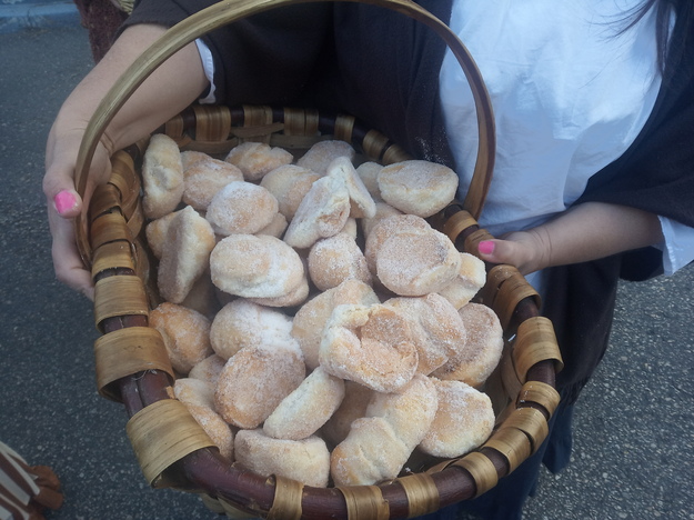 La celebración comenzó en la plaza de La Constitución, frente al Ayuntamiento, donde se inició el recorrido por distintas calles de la localidad. Desde allí partió la “procesión” acompañada de multitud de azudenses de todas las edades, sobre todo jóvenes. Un carro transportaba el mosto (600 litros) y otro los bollos (6.000 unidades). Los fueron repartiendo entre el público distintos personajes caracterizados como labradores. En medio del ambiente festivo, amenizado por los dulzaineros azudenses “El Pico del Lobo”, un dócil animal transportaba las espigas.