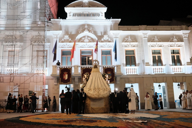 Tanta era la afluencia de personas que se ha tenido que limitar el acceso a la Plaza Mayor de Guadalajara, porque un gran espacio estaba delimitado por la instalación de una alfombra floral en conmemoración de la procesión la Virgen de la Antigua.