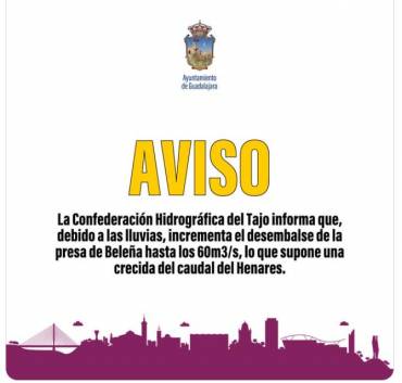 En este sentido, el Ayuntamiento de Guadalajara acaba de hacerse eco de las información de la Confederación Hidrógráfica del Tajo que advierte de que se aumenta el caudal desembalsado de Beleña en el río Sorbe que junto al Bornova (Embalse de Alcorlo) son los afluentes principales del Henares que al final llega a la capital, sobre todo en los barrios habitados de La Chopera y Los Manantiales.