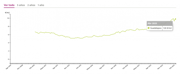 Según el análisis realizado por el portal inmobiliario Idealista, el precio medio del metro cuadrado para alquilar es de 9,1euros, una cifra que sube hasta los 9,8 euros en Guadalajara capital y que es más caro aún en Azuqueca donde el precio medio del metro cuadrado en abril de 2025 es de 10,3 euros el metro.