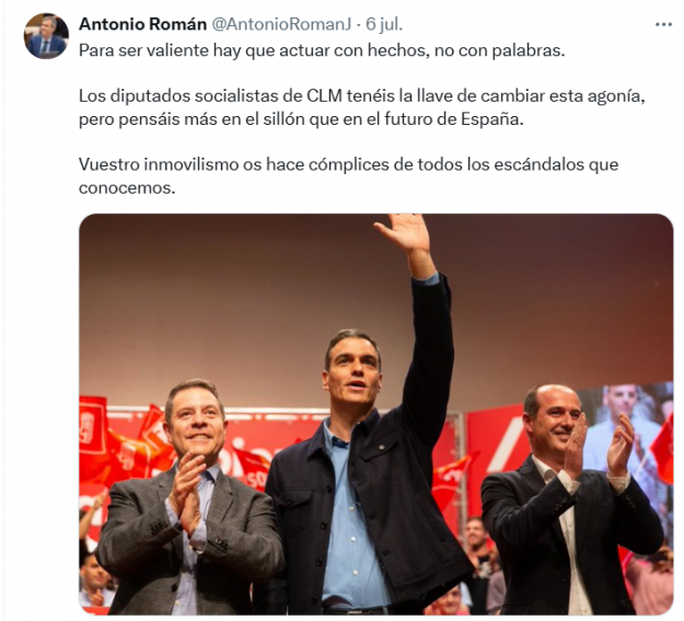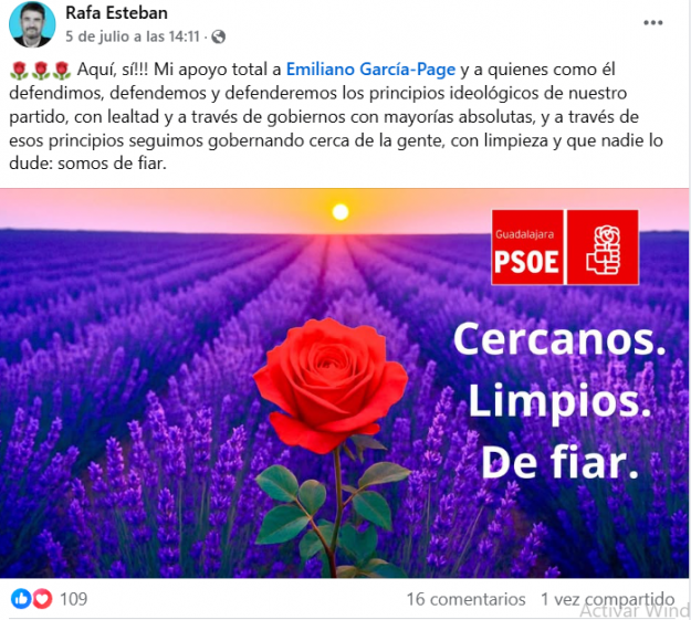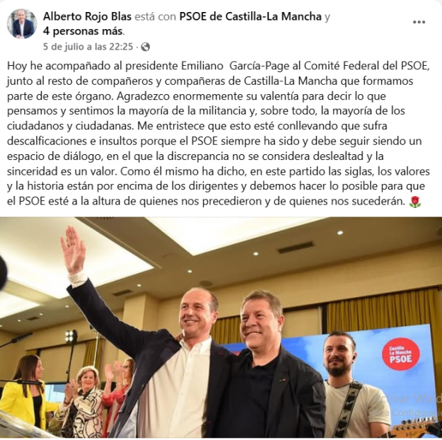En su mensaje de apoyo Alberto Rojo agradecía a Page su “valentía para decir lo que pensamos y sentimos la mayoría de la militancia y, sobre todo, la mayoría de los ciudadanos y ciudadanas. Me entristece que esto esté conllevando que sufra descalificaciones e insultos porque el PSOE siempre ha sido y debe seguir siendo un espacio de diálogo, en el que la discrepancia no se considera deslealtad y la sinceridad es un valor”