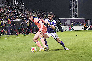 Ante el cerrojazo de la defensa local, el Barça recurría a disparos lejanos, lanzamientos de faltas o balones al área. El peligro, cuando llegó realmente a presentarse, lo conjuró bien el cancerbero morado. Al final de los primeros 45 minutos 0-0 en el marcador. El pez pequeño le aguantaba al grande en la pelea: el Dépor estaba dando una imagen soberbia.