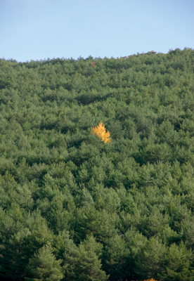 La fotografía está tomada en el bosque de ribera que hay cerca del pueblo. Alamos y chopos tornan de color, mientras que un rebollo amarillo da la nota en un pinar de verde intenso.