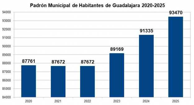 Guadalajara se ha convertido en la capital de Castilla-La Mancha que más crece y ha alcanzado los 93.470 empadronados a fecha de 1 de enero de este año 2025, según los datos del padrón municipal.