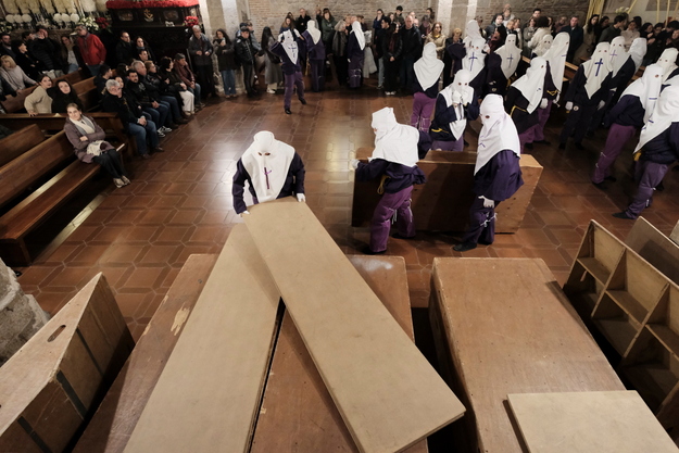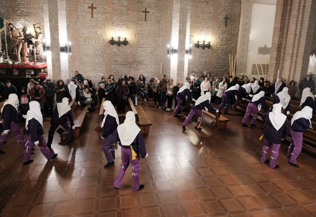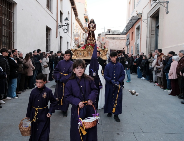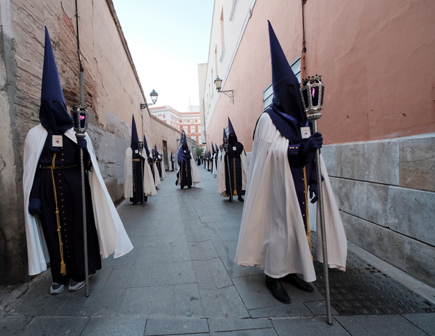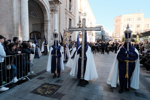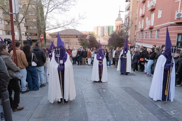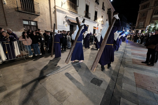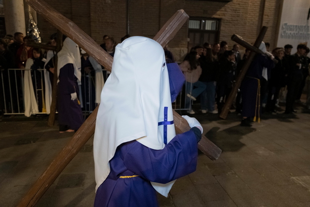 En la procesión de Jueves Santo, la más numerosa, los cofrades llevan una sencilla túnica morada, con cíngulo amarillo, y capirote blanco, que es sustituido por uno negro para la procesión del Silencio y Santo Entierro ya el Viernes Santo.