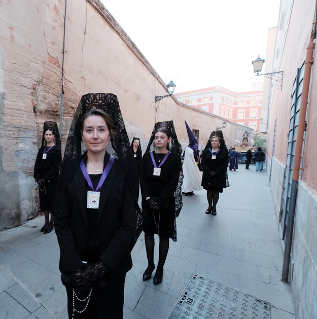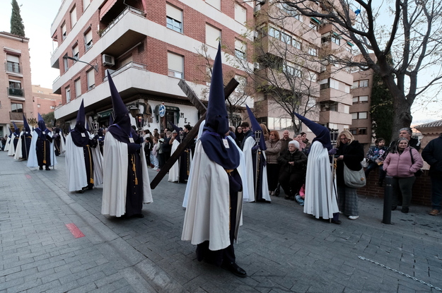 Los hermanos visten capa de color crema y capirote morado. Muchos de ellos ya participaron en la procesión de la Misericordia, que esta hermandad realiza el día de Lunes Santo y que abre los desfiles procesionales de Guadalajara.