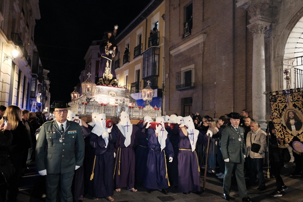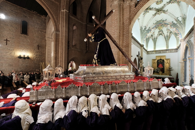 Tanto el trono del Cristo como el de la Virgen se carga con varas al estilo castellano más tradicional. Esta austeridad castellana se expresa también en la música a cargo del grupo de tambores de la Cofradía y del grupo de dulzaineros Mahurotos de Guadalajara, que interpretan piezas de dulzaina escritas para Semana Santa.