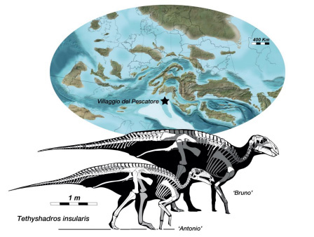 Los increíbles hallazgos de Villaggio del Pescatore han permitido a los investigadores reescribir algunas hipótesis sobre cómo eran los ecosistemas terrestres en las islas de aquel archipiélago. Sabemos que las poblaciones de grandes animales que habitan islas durante un largo periodo de tiempo tienden a disminuir su tamaño, un cambio propiciado seguramente por la ausencia de predadores y la mayor escasez de recursos. Pues bien, hace poco más de una década, un espécimen muy pequeño de Tethyshadros encontrado en Villaggio del Pescatore (apodado Antonio) había llevado a los investigadores a interpretarlo como un caso de enanismo insular. Antonio viviría en una isla en mitad de un océano ‘proto-Mediterráneo’ llamado Tethys. ‘Sin embargo, los nuevos especímenes (por ejemplo, uno bautizado como Bruno, mucho más grande) confirman que Antonio era en realidad un individuo inmaduro, y que estos hadrosaurios no habían sufrido un proceso de miniaturization como se pensaba antes’, explica Matteo Fabbri, coautor del artículo.